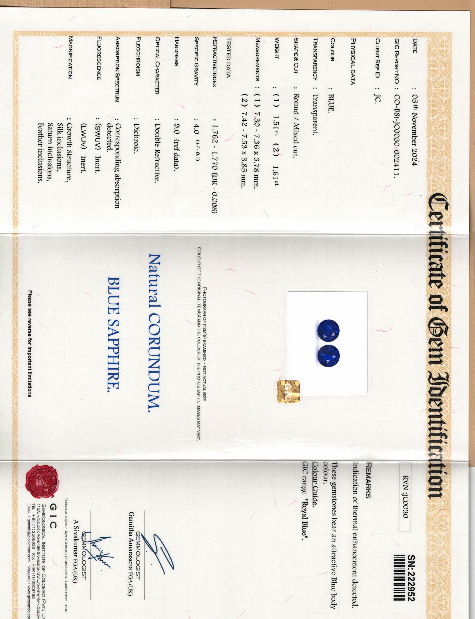 Blue Round Sapphire Pair Sri Lanka H 7.3X7.4X3.8